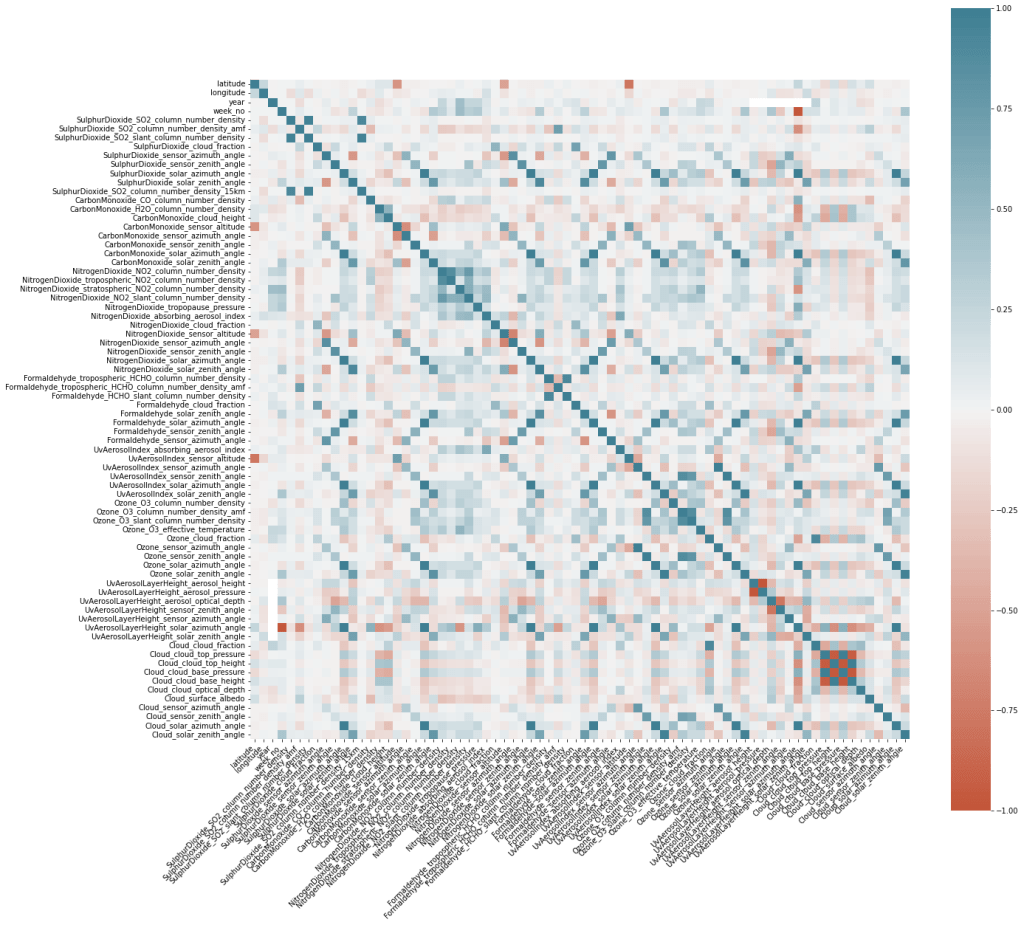 Finally I used some code from Drazen Zaric’s article on correlation matrices using Seaborn to generate the matrix below. I have only scanned it, but much of the high correlation I see are with intuitively related features, e.g. SO2 density and SO2 density 15 kilometers away. I need to add the target variable back into the dataset to look for correlations, but that will come later. For now, it is enough to know there will be some co-correlations we may need to address.