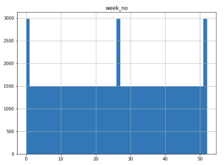 The histogram of records by week number show double the number on the first, middle, and last week of the year: